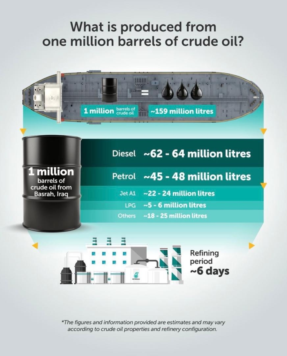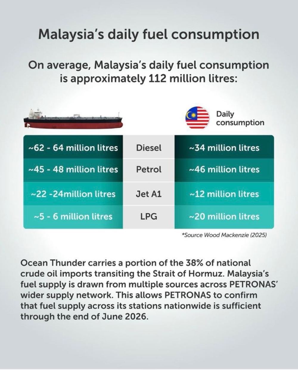Petronas confirmed the arrival of its tanker Ocean Thunder this morning with its cargo of one million barrels of crude oil from Basrah, Iraq, as part of efforts to stabilise fuel supply.