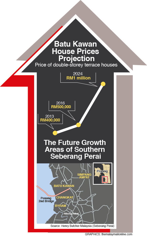 “New residential double storey terrace houses in Batu Kawan are now being priced at RM400,000 per unit and is set to increase steadily, to reach RM500,000 in three years’ time; and 10 years from now, a unit could cost about RM1 million,” said Fook Tone Huat, an associate director at Henry Butcher Malaysia’s Seberang Perai office.