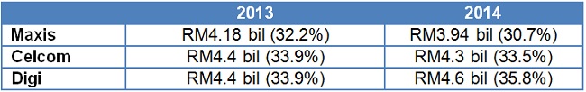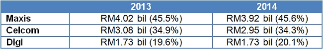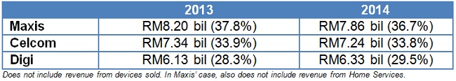 However, total revenue amongst the big three operators dipped slightly to RM21.43 billion, versus RM21.67 billion in 2013.