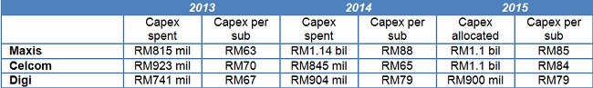 In 2014, the incumbents collectively, spent RM2.89 billion in capex, or about 16 per cent more than what they spent in 2013 (RM2.48 billion). As mobile broadband is becoming an essential part of the business, it is not surprising that a big bulk of their capex went to this area.