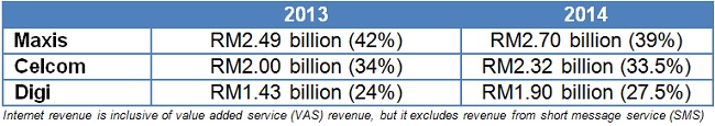In 2014, the big three mobile operators cumulatively grew their Internet revenue by 16 per cent to RM6.93 billion, versus RM5.9 billion in 2013.