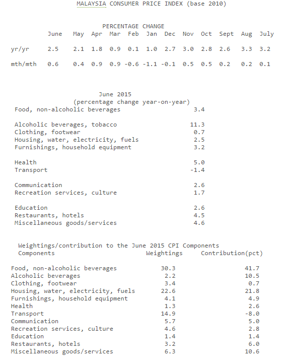 KUALA LUMPUR, July 15 — Malaysia’s consumer price index in June rose 2.5 per cent from a year earlier on higher food prices, data from the Statistics Department showed today. Transport prices also saw an increase from a month ago.