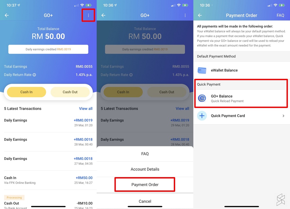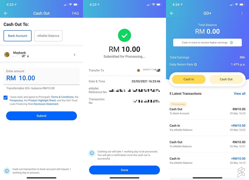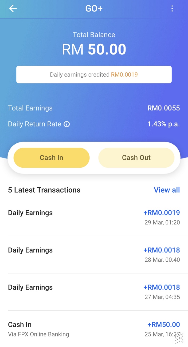 At the time of writing, the listed Daily Return Rate is at 1.43 per cent per annum. After 3 days, we have accumulated RM0.0055 in earnings with a RM50 cash-in.
