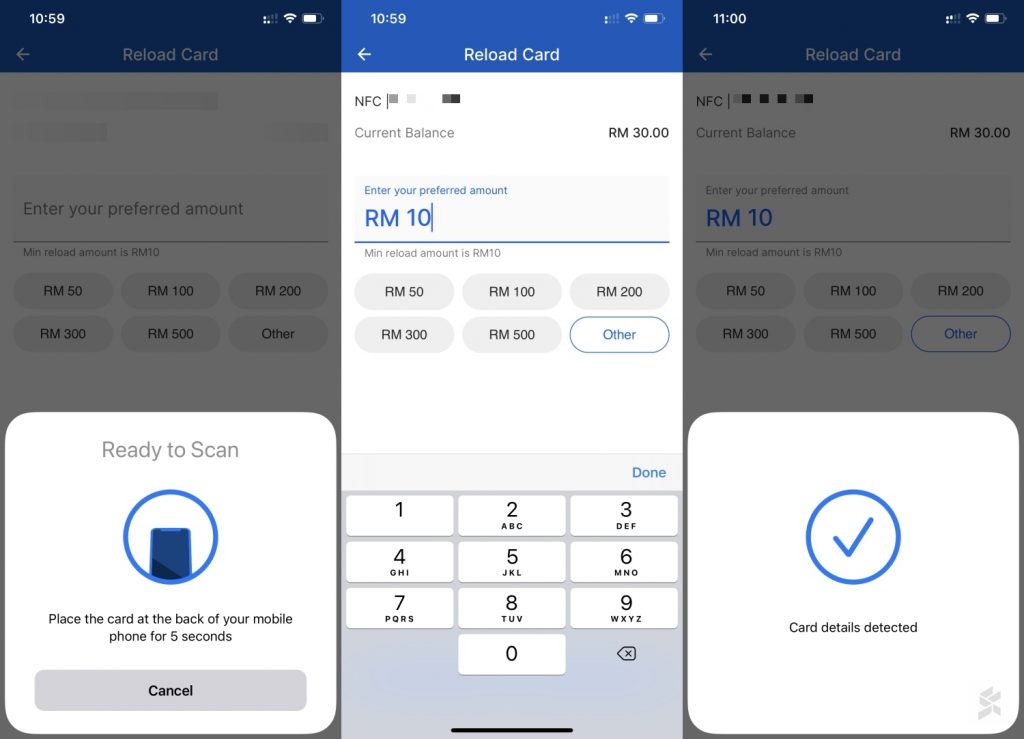 Just go to the TNG Card section (you can find this under Toll) and make sure you’ve added the card to your TNG eWallet. To reload, just tap on the “reload” button on the screen, tap the card at the back of your phone, enter the top-up amount, and then tap the card again to transfer the value. Take note that the minimum top-up amount is RM10.