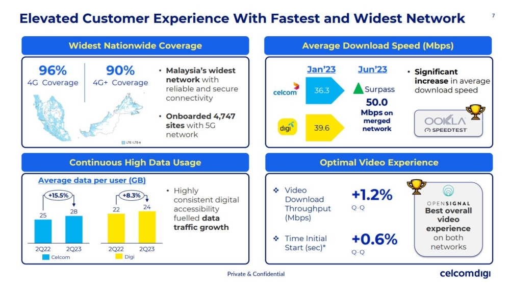 As a result, CelcomDigi says customers can expect improved quality and experience from the newly merged sites. As published in their Q2 2023 report, the network has recorded a significant increase in average download speeds from 36.3Mbps on Celcom and 39.6Mbps on Digi back in January 2023 to over 50Mbps on the newly merged network.