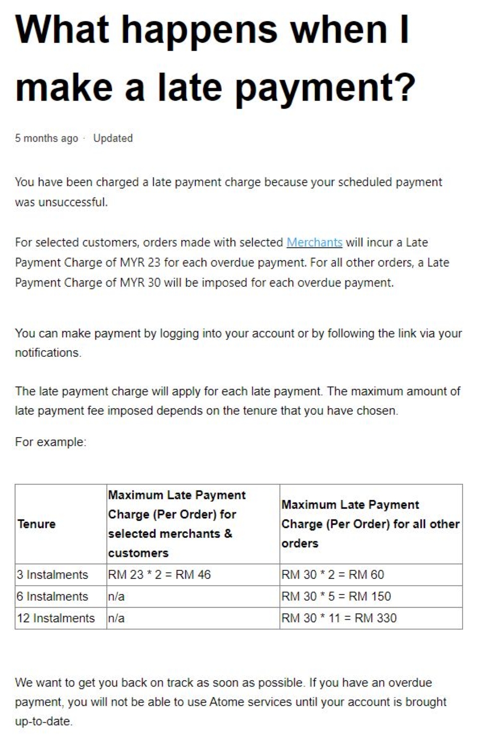 According to Atome, in the event of late payments, a late payment charge of RM23 will be applied. However, in certain cases, there will be an additional penalty of RM7. This new update will apply to orders created on and after 9th May 2024.
