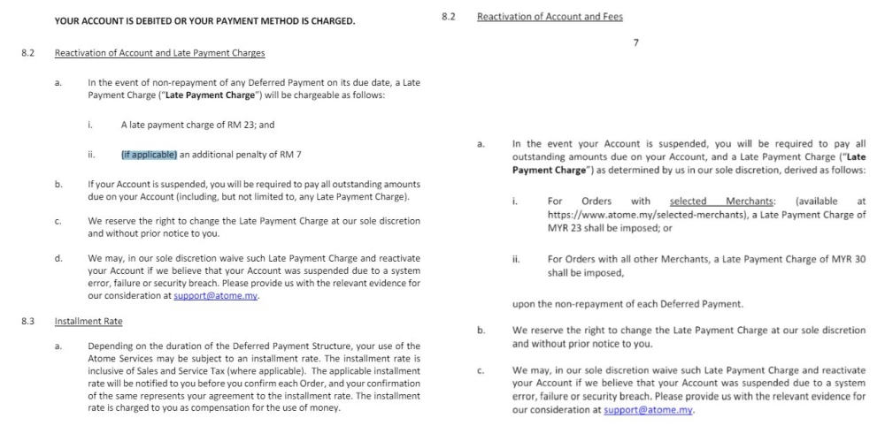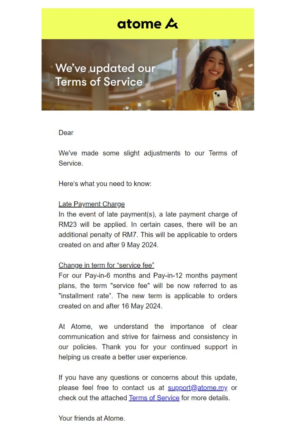 KUALA LUMPUR, April 23 ― Buy Now Pay Later (BNPL) platform Atome has recently notified all users about their updated Terms of Service. According to the email, there are some slight changes to Late Payment Charge and the term used for “service fee”. Upon closer look, the late payment charge seems vague, unlike its current terms of service.