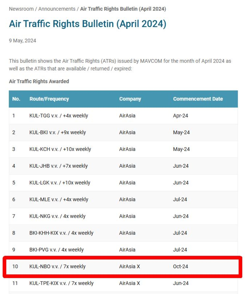 In April 2024, AirAsia X was awarded the Air Traffic Rights (ATR) from Mavcom to serve the KUL to NBO route with up to 7x weekly commencing October 2024.