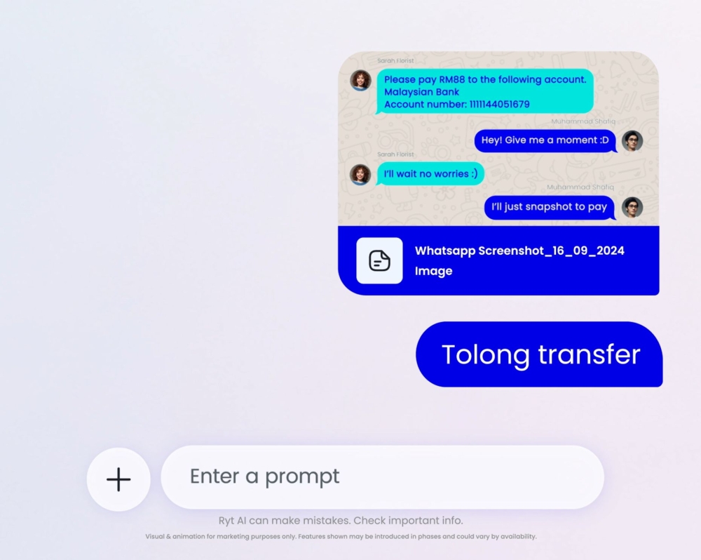 Ryt AI is claimed to be intelligent enough to handle attachments to help you save time. In the example given, you can provide it with a screenshot of a chat conversation requesting for a payment and Ryt AI will take over the menial task of entering the transaction amount and bank account number to initiative a fund transfer.