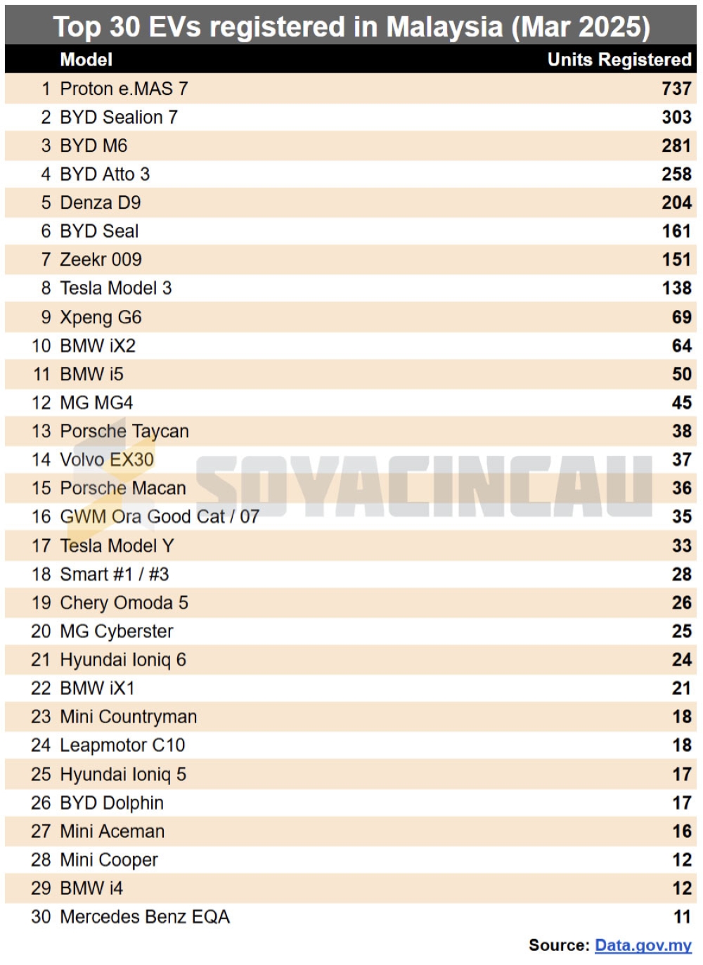 Another interesting entry is the MG Cyberster which recorded 25 units, beating the BYD Dolphin which only recorded 18 units. Hyundai appears to be making a comeback with the Ioniq 6 at No. 21 with 24 units and the Ioniq 5 at No. 25 with 17 units.