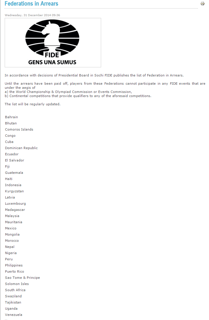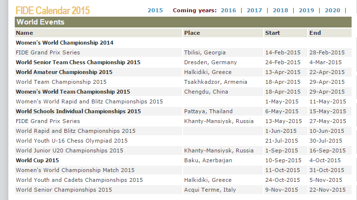 JANUARY 8 — We are now a week into 2015 so let’s take a look at the FIDE (World Chess Federation) calendar to see what is going on.