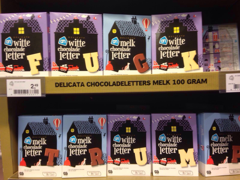 The day after Trump’s election, this chocolate biscuit rearrangement was spotted by a friend while shopping in an Amsterdam supermarket.