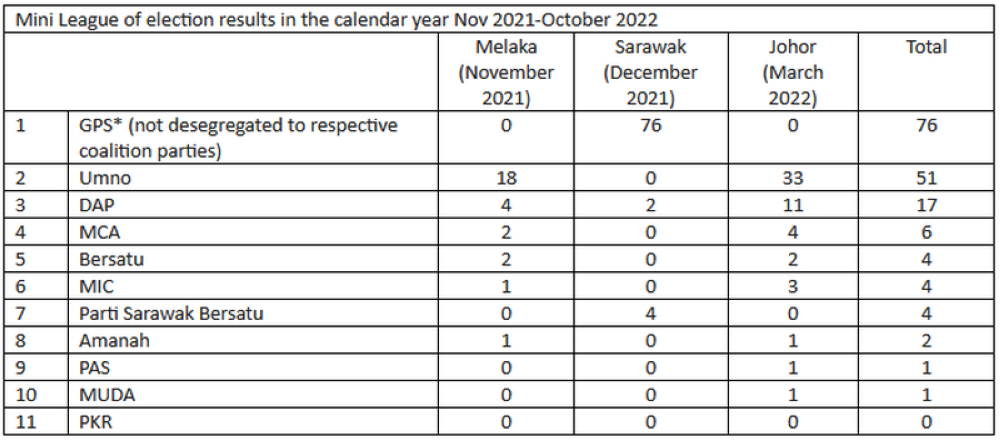 In a mini league of the last calendar year’s elections, November 2021 to October 2022, PKR would finish 11th or dead last. It has zero wins in the last year.