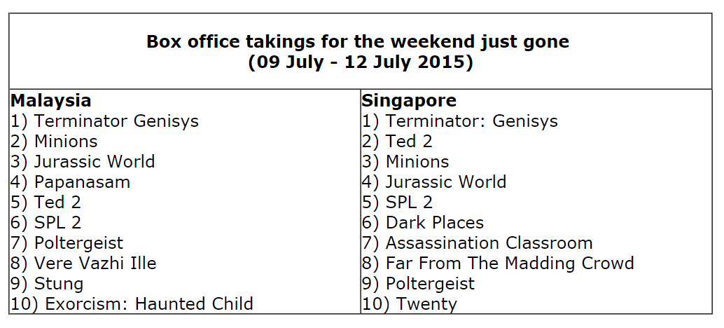 Meanwhile, there were no changes to Malaysia’s box office chart last weekend as “Terminator Genisys” still conquered number one, leaving number two to still be infested by the bug-eyed “Minions” and number three still inhabited by “Jurassic World”.