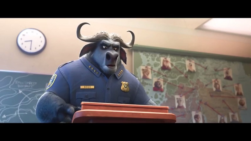 In this clip, Chief Bogo (voiced by Idris Elba) speaks to his Zootopia police force and can be seen addressing the “elephant in the room”.