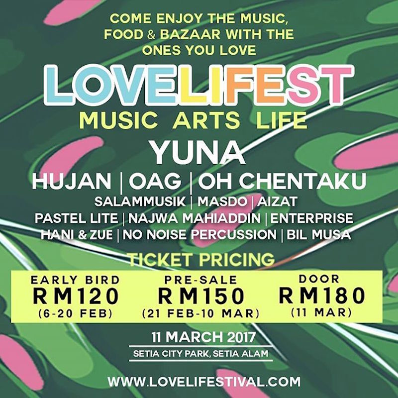 Early Bird ticket for the festival is at RM120 (February 6-20), pre-sale is at RM150 (March 21-10), while door-sale is at RM180 (March 11).
