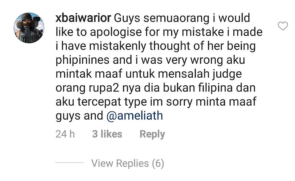The owner of the second comment meanwhile, later commented once again, apologising for the misunderstanding of thinking Amelia is Filipino.