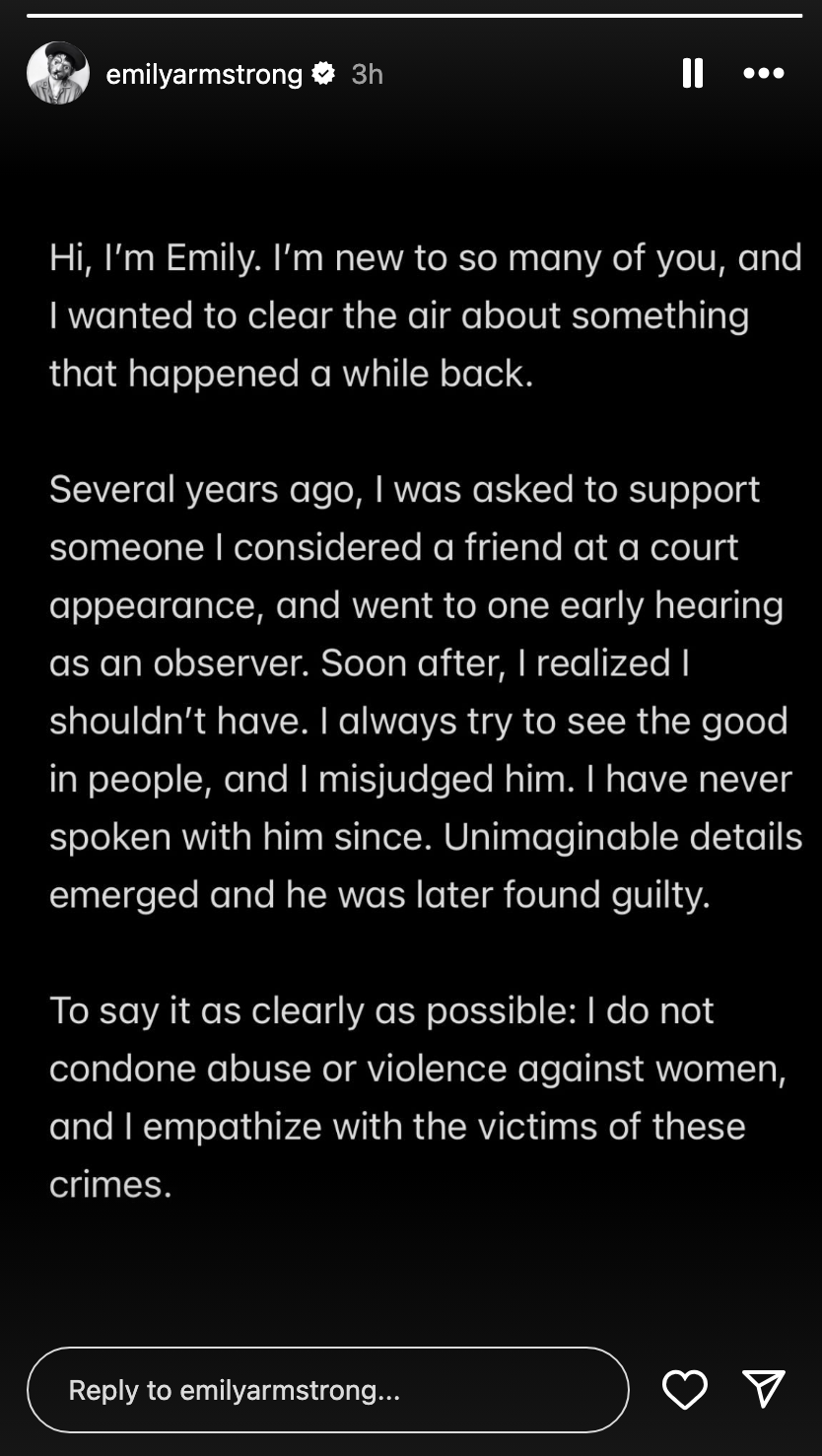 “Hi, I’m Emily. I’m new to so many of you, and I wanted to clear the air about something that happened a while back,” she wrote.