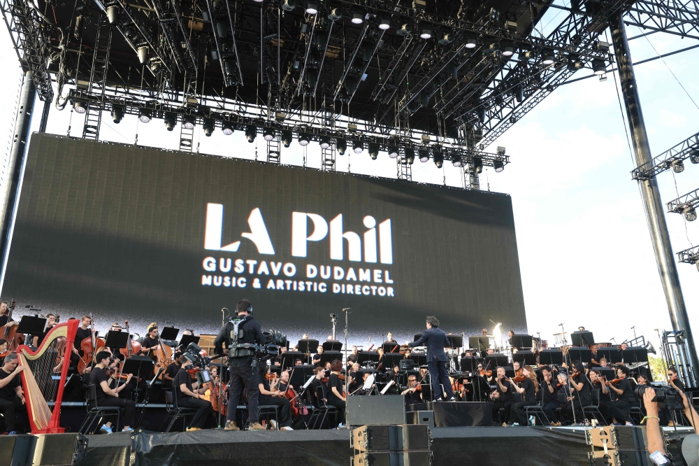 At an earlier sunset performance Gustavo Dudamel led the Los Angeles Philharmonic in a sweeping sunset show that turned the concept of genre on its head, marrying orchestral arrangements with an eclectic crop of collaborators including rapper LL Cool J, Country star Maren Morris and Icelandic jazz-inspired pop singer Laufey.