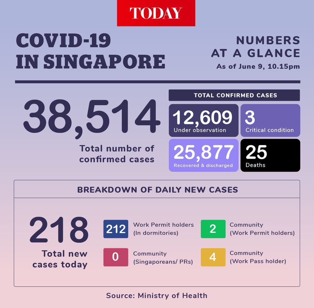 SINGAPORE, June 9 — There are 218 new cases of Covid-19 reported today by the Ministry of Health (MOH). This is the lowest daily tally reported here in a while that was not attributed to fewer tests being conducted, as was the case on some days.