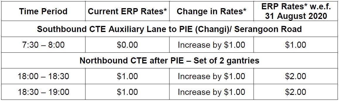 LTA noted that the ERP rate for the gantry along the southbound CTE before Braddell Road will remain unchanged at S$1 from 8am to 9am.