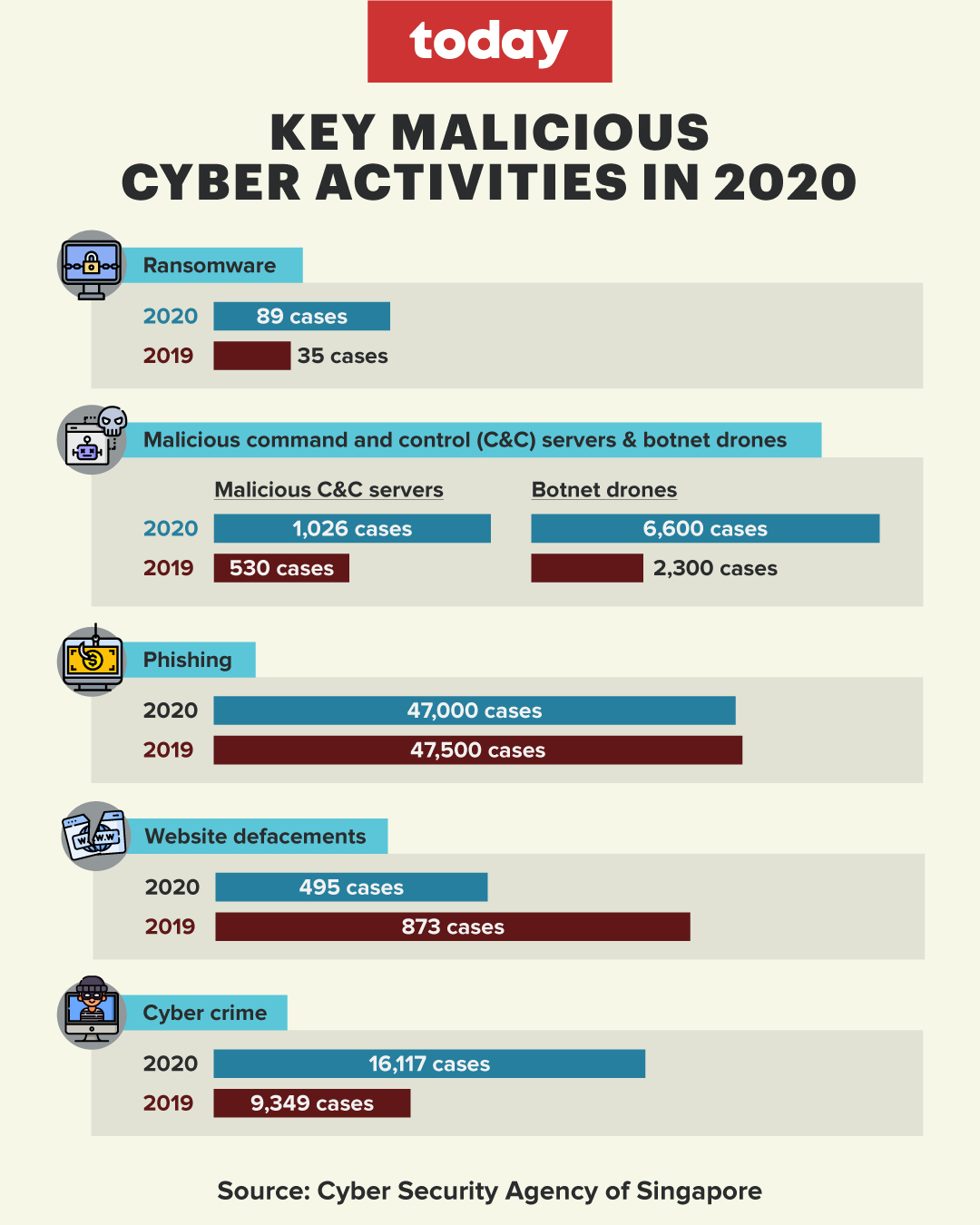 Last year, CSA observed 1,026 malicious command and control servers hosted in Singapore — a 94 per cent jump from the 530 command and control servers reported in 2019. These servers are used alongside botnet drones by cyber criminals.