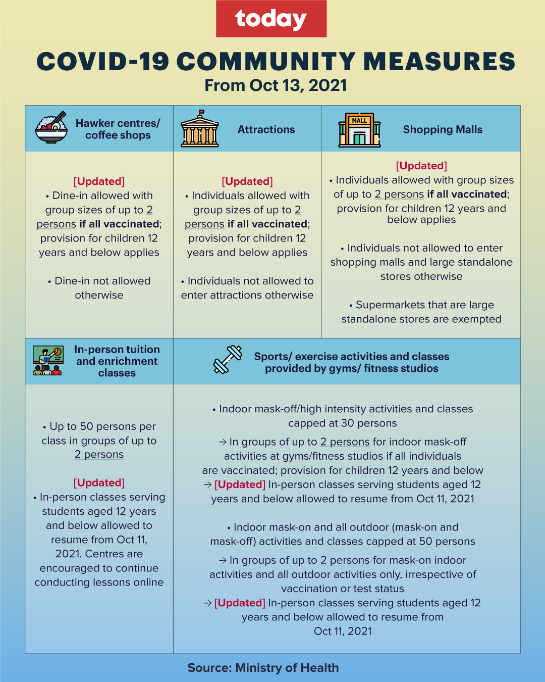 SINGAPORE, Oct 10 — Starting Wednesday (Oct 13) those who are not fully vaccinated will not be allowed entry into malls, large standalone stores, attractions, hawker centres and coffee shops, so as to protect them and reduce the strain on the healthcare system, the Ministry of Health (MOH) said.