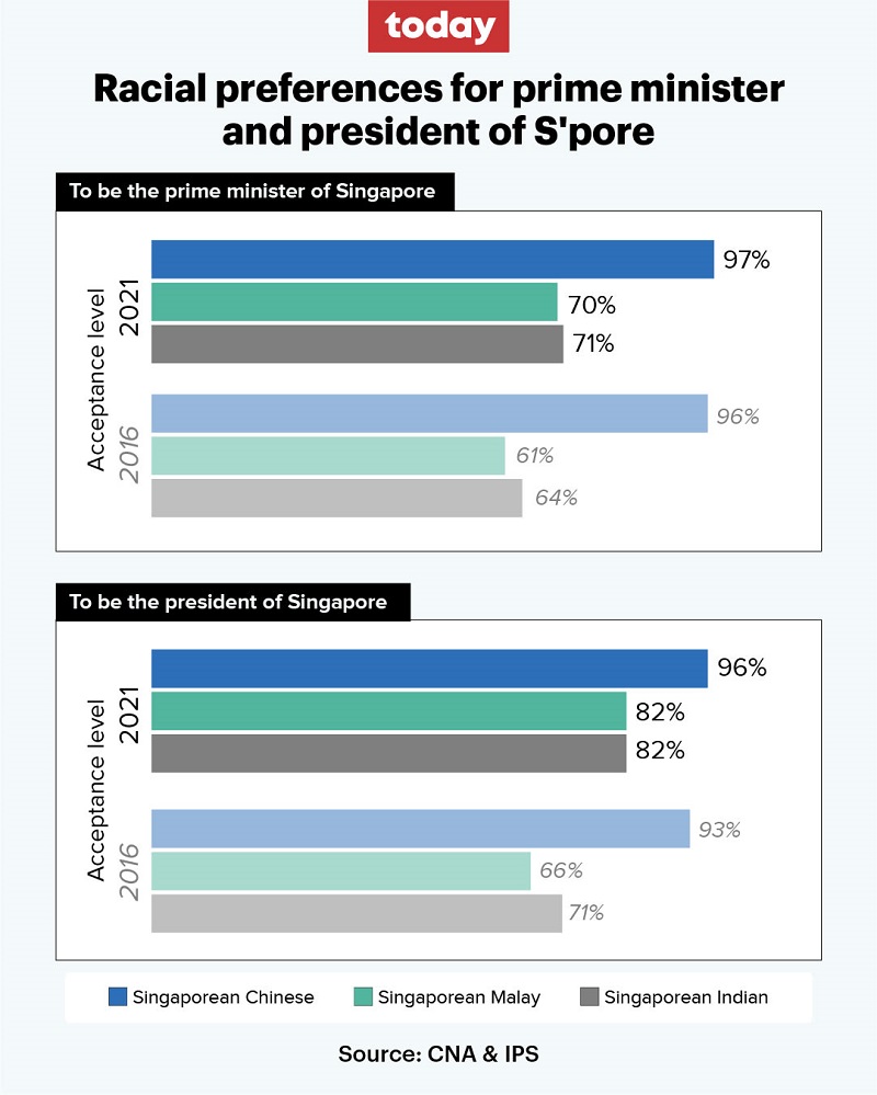 The percentage of respondents indicating that they preferred a Singaporean Chinese to be President or Prime Minister was above 90 per cent, similar to figures from 2016.