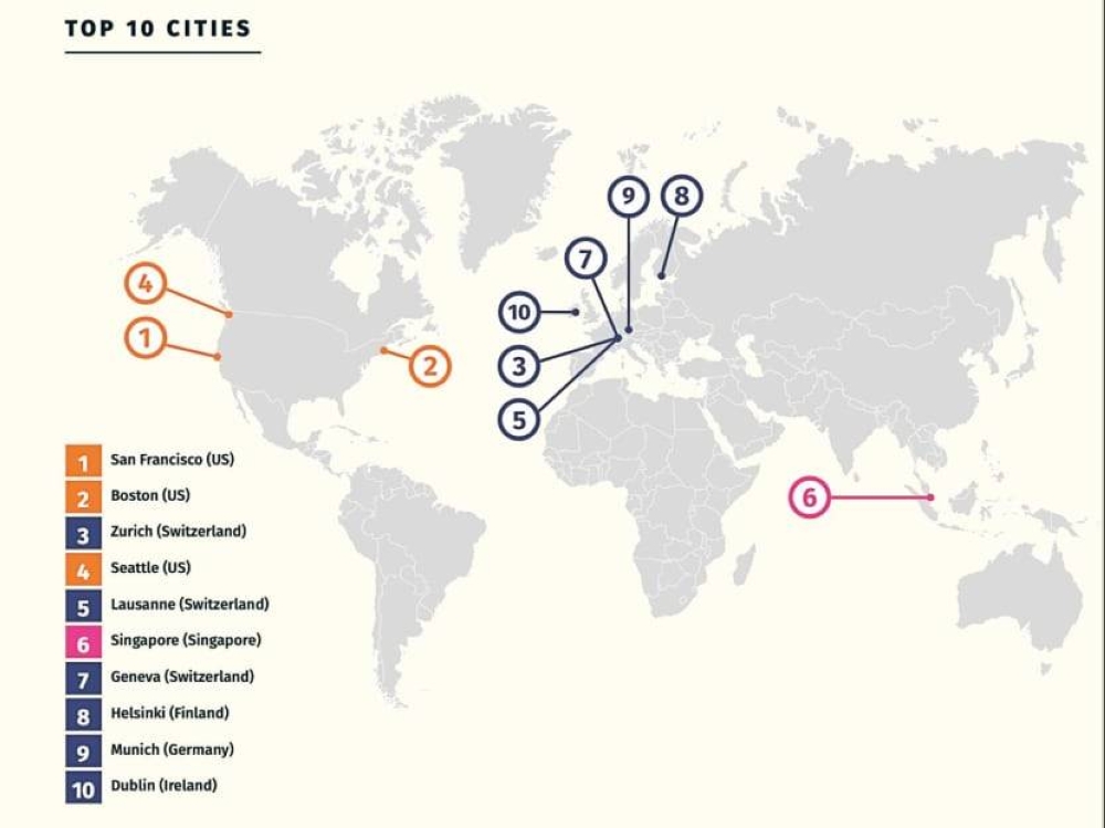 In the ranking by cities, the top five before Singapore were leader San Francisco in the United States, followed by Boston in the US, Zurich in Switzerland, Seattle in the US and Lausanne in Switzerland.