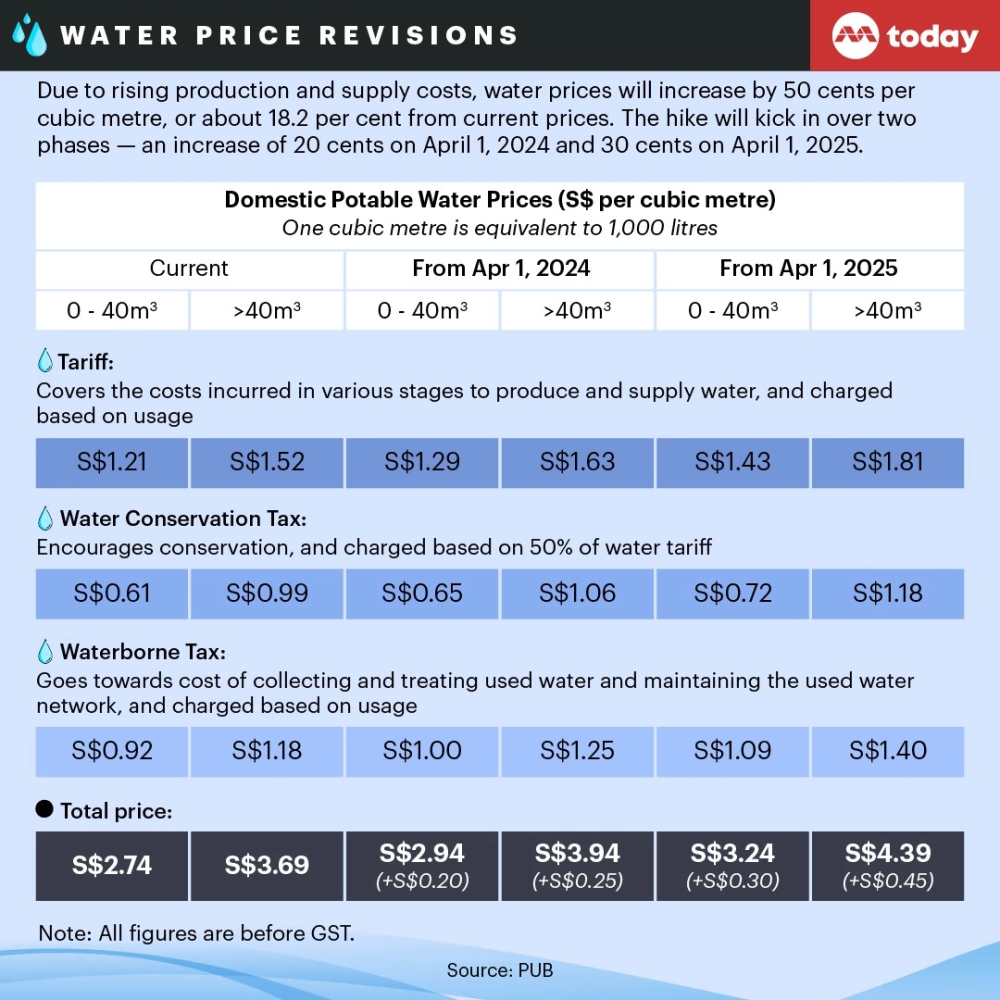 • A further increase of 30 cents per cubic metre will be rolled out on April 1, 2025, raising the price to S$3.24