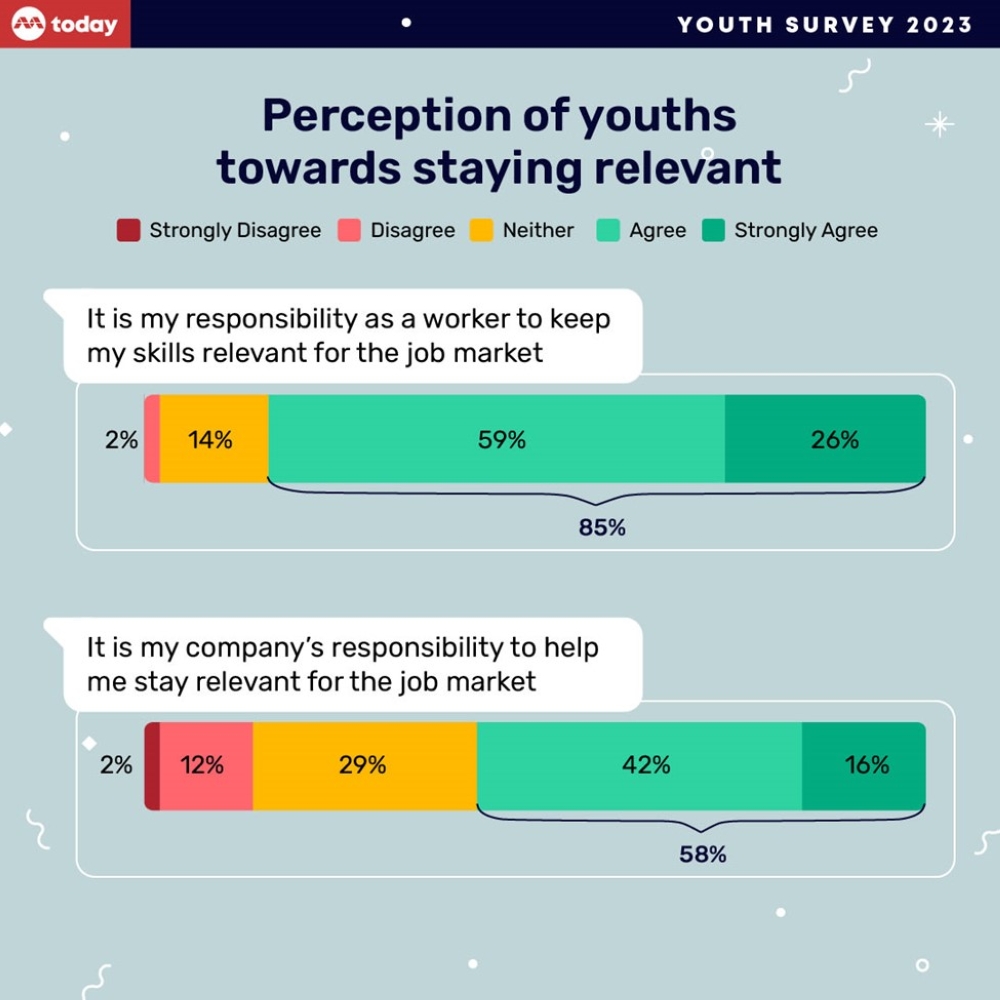 Many youths agree: The TODAY Youth Survey 2023 found that 85 per cent of respondents believe it is their responsibility as a worker to keep their skills relevant for the job market, while only 58 per cent believed that companies should be the ones responsible for keeping their workers relevant.