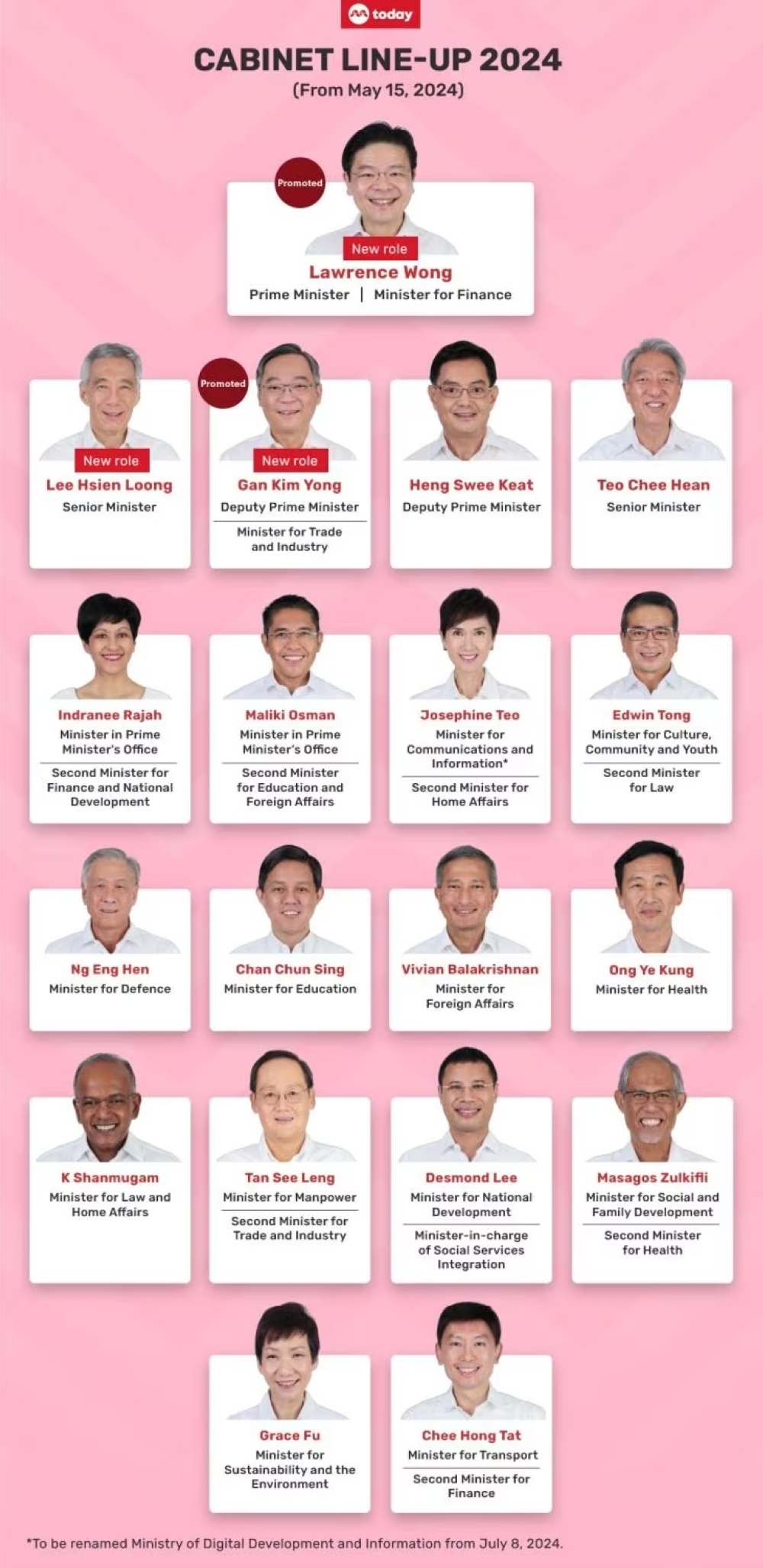 Aside from the portfolio changes, the Prime Minister’s Office (PMO) announced on Monday that the Ministry of Communications and Information will be renamed as the Ministry of Digital Development and Information.