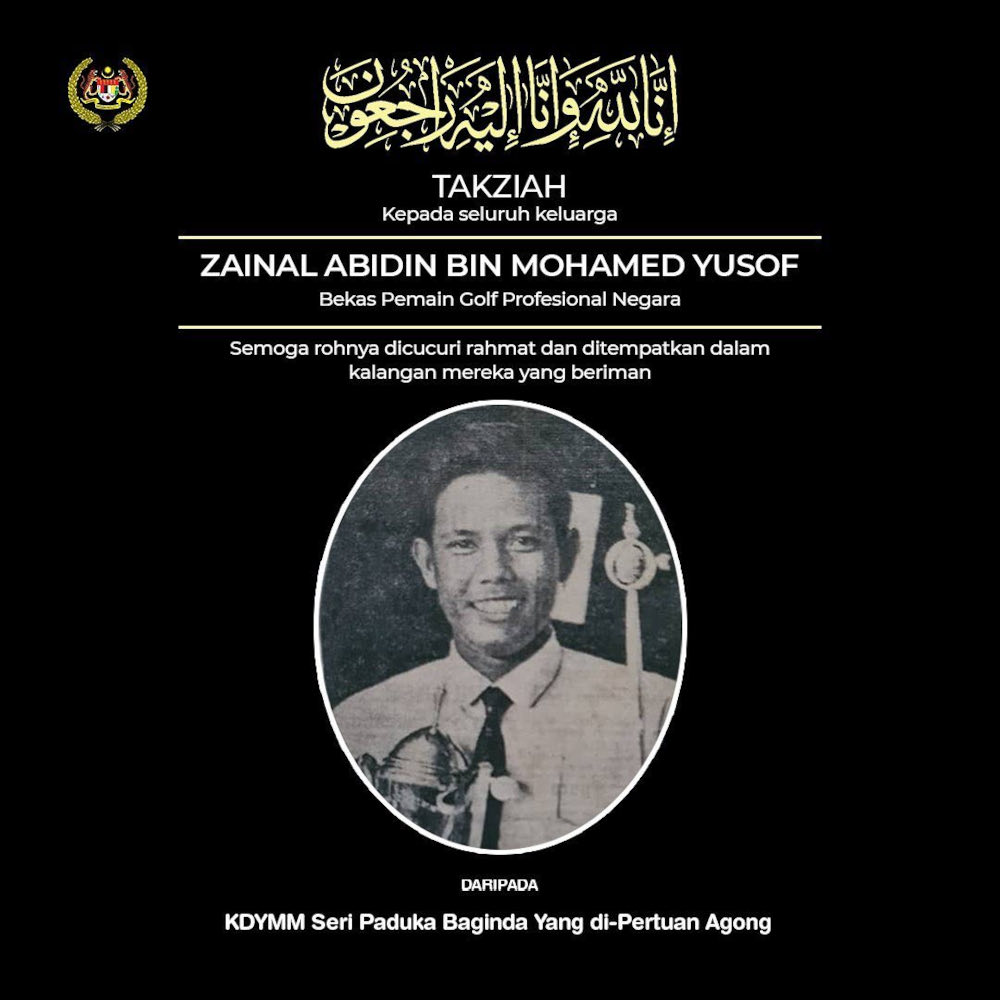 KUALA LUMPUR, July 7 — National veteran golfer Zainal Abidin Mohamed Yusof died today due to a kidney infection. He was 78 years old.