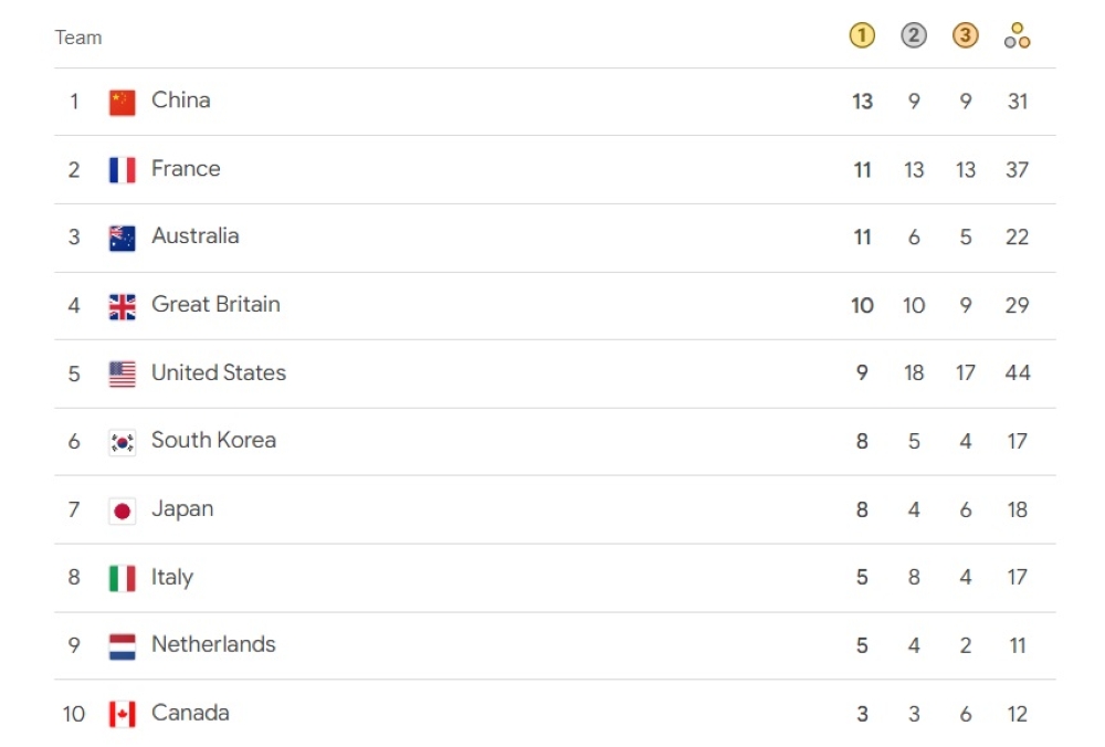 The US still leads in overall medals with 44, while France has surprisingly shot up to second place in overall tally with 37 against China’s 31.