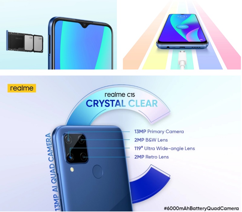 Powering the C15 is a large 6,000mAh battery and it supports 18W fast charging via its microUSB port. The device still comes with a 3.5mm headphone jack and it has a rear-mounted fingerprint sensor. Out of the box, it runs on Android 10 with Realme UI skin on top. — SoyaCincau