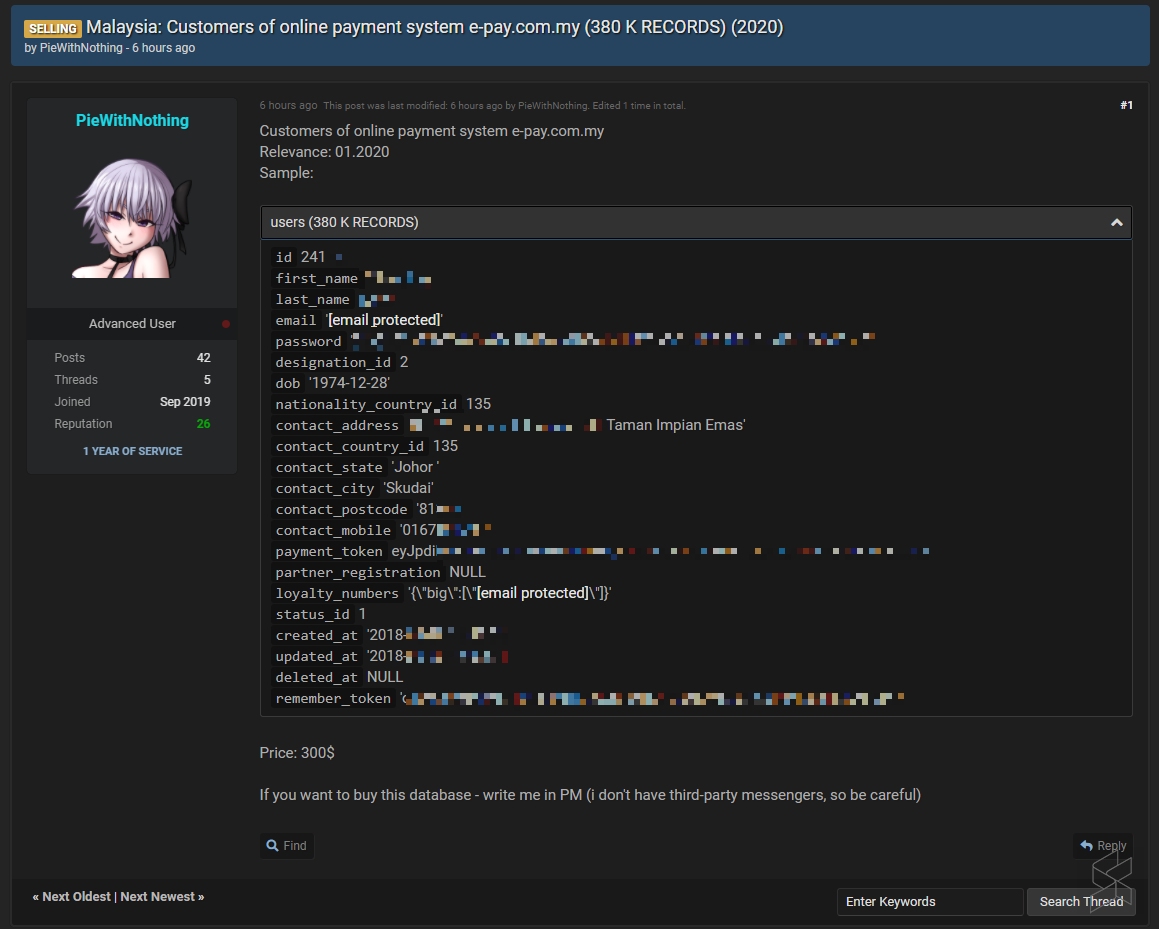 A threat actor was spotted selling a database of 380,000 customers on a data sharing forum for US$300 (about RM1,215). That’s about 0.32 sen per user.