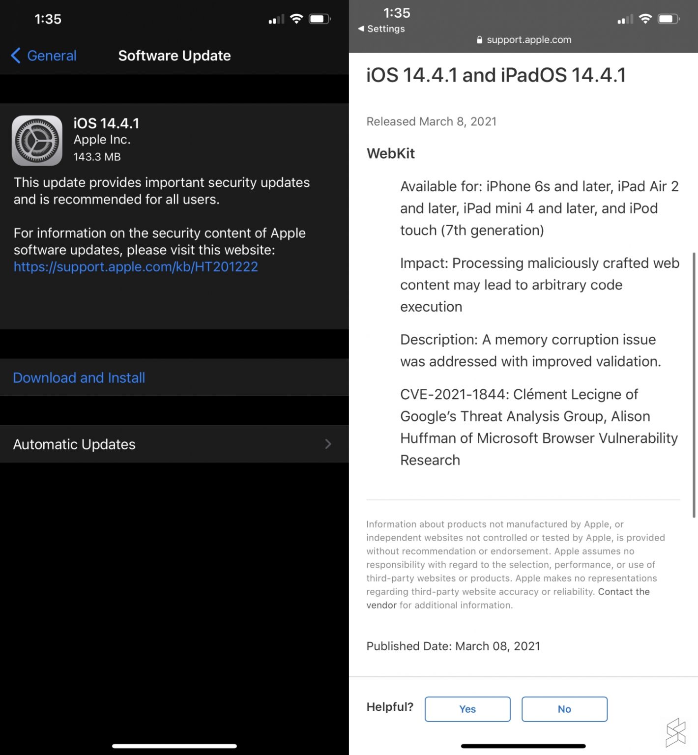 According to the change log, iOS 14.4.41 patches a vulnerability in WebKit, which is the browser engine that powers Safari and third-party browsers on iOS. The update is available now for iPhone 6s and later, iPad 2 and later, iPad mini 4 and later and iPod Touch (7th gen).