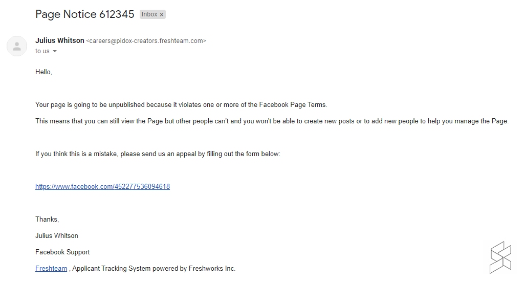 Recently, we’ve received an email claiming that our Facebook page has violated one of more of Facebook Page’s terms. Without providing much information on the actual “violation”, the email directs you to a Facebook URL where you can supposedly file an appeal.