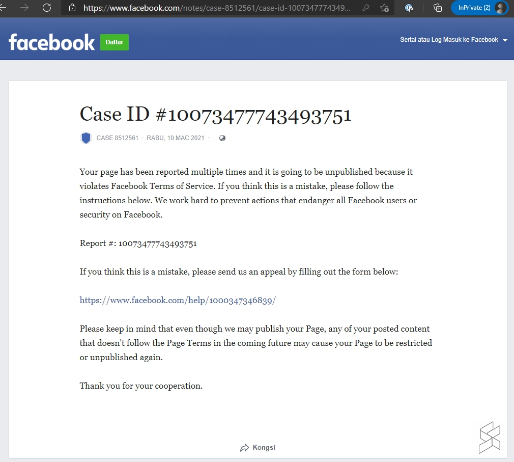 If you’re a Facebook page owner, we would want to remind you to be aware of such phishing tactics. Always check on the Facebook platform itself instead of clicking on a link from an email or other channels outside of Facebook.