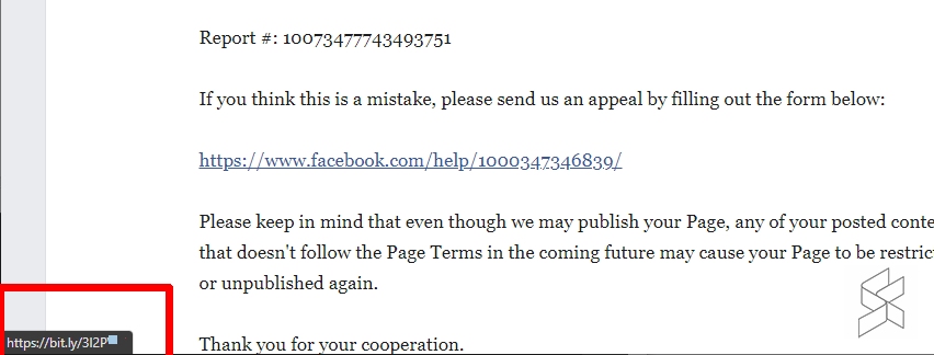 What’s scary is that they can disguise a URL which links to another location. As shown below, the supposed link to file an appeal, actually links to a bit.ly URL instead of an official Facebook page.