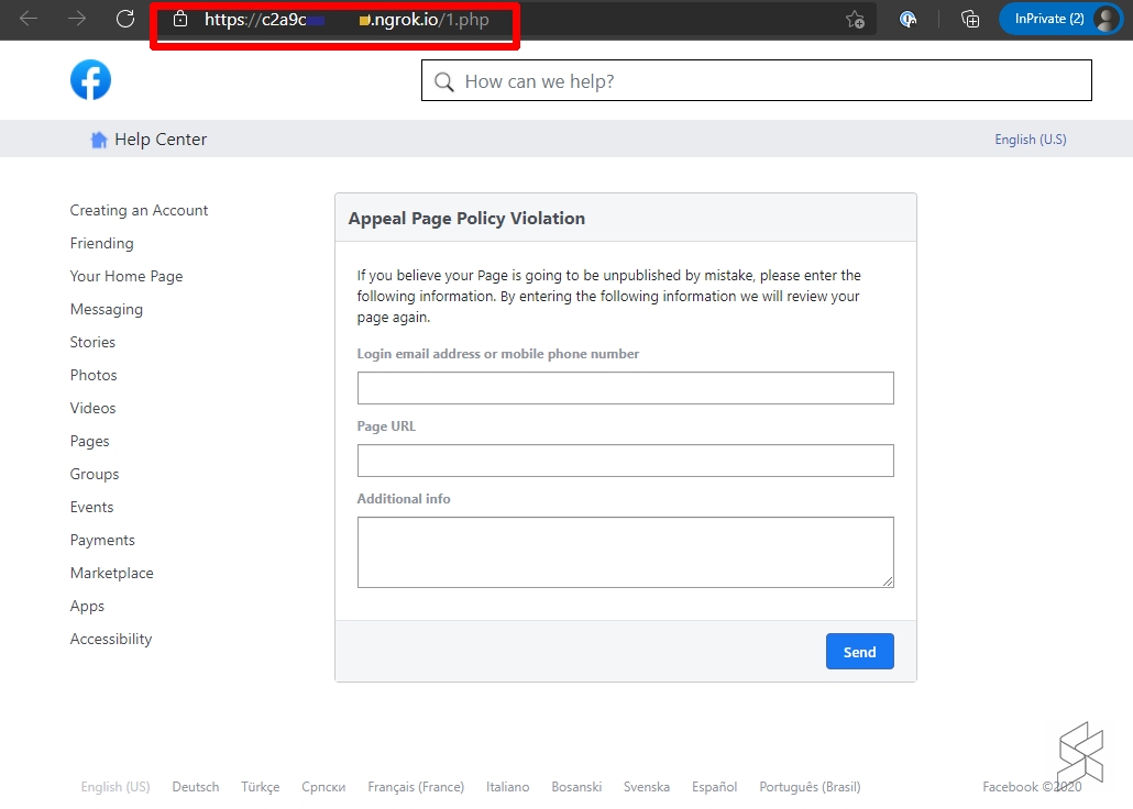 If you click through, it lands on a different website that pretends to be a Facebook page. The page which has a typical Facebook Help Centre interface shows an “Appeal Page Policy Violation” form which will requires you to provide your email address, page URL and your password.