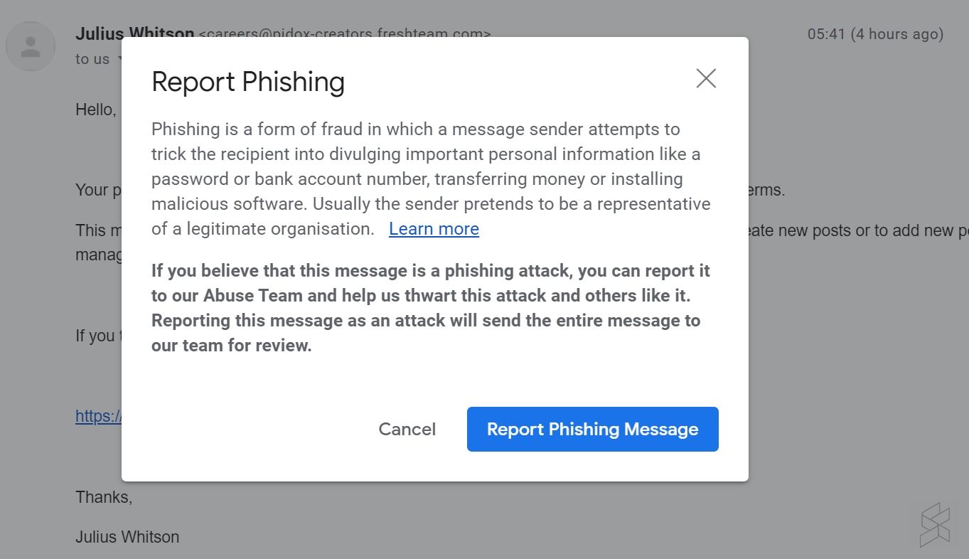 To prevent the scammers from targeting other victims, you can do your part by reporting the email or the Facebook page for scam or misleading activities. If you’re using Gmail, you can report the email as a Phishing Message for their internal review.