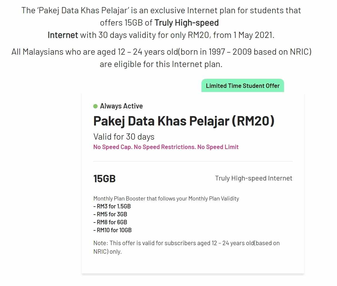 For RM20, students can get 30-day access to 15GB of high-speed data that comes with no speed caps. This offer is now open to all Malaysian students aged 12 to 24 years old (Born in 1997 to 2009 based on NRIC).