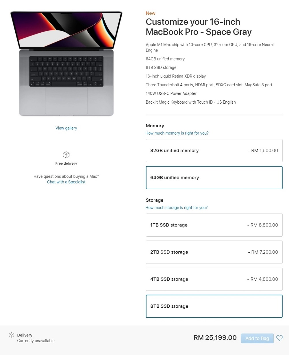 When you max out the MacBook Pro 16 hardware options, the notebook will cost you RM25,199. This is for the M1 Max 10-core CPU, 32-core GPU option with 64GB unified memory and 8TB of SSD storage.
