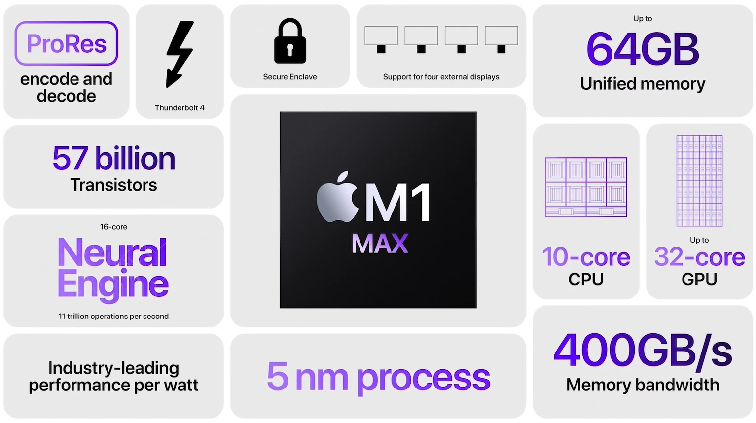 It comes with a 10-core CPU and can be configured with up to 32-core GPU. Apple claims that it offers a similar graphics performance to the highest-end GPU in the largest PC laptops while using up to 100 watts less power. The Max offers up to a whopping 400GB/s of memory bandwidth.