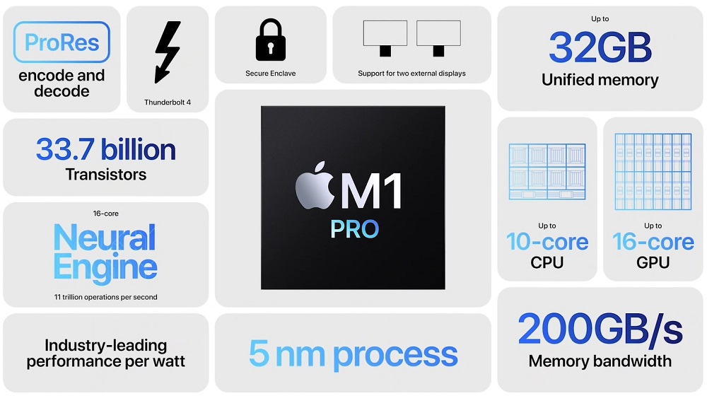 The M1 Pro is offered with 8-core or 10-core CPU options with either 14-core or 16-core GPU. It also features a 16-core Neural Engine for AI processing and boasts 200GB/s of memory bandwidth.