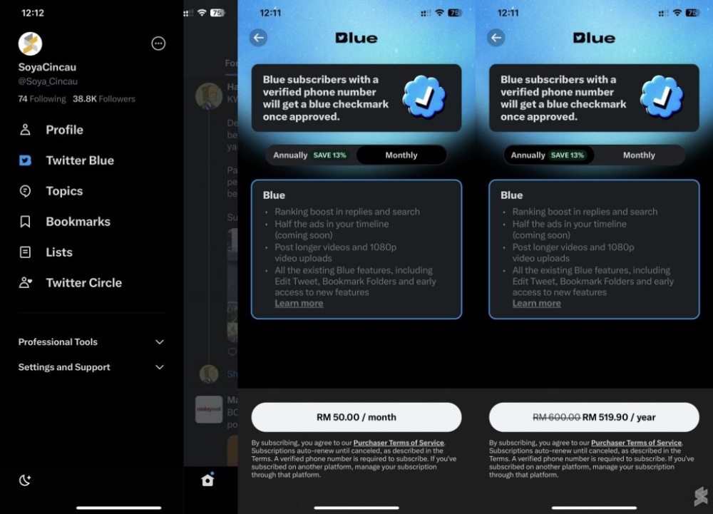 If you’re on an iOS or Android device, Twitter Blue costs RM50.00/month or you can save 13% by going for an annual plan which costs RM519.90/year. However, if you sign up on the Twitter website, it is significantly cheaper at RM35.00/month or RM369.00/year.