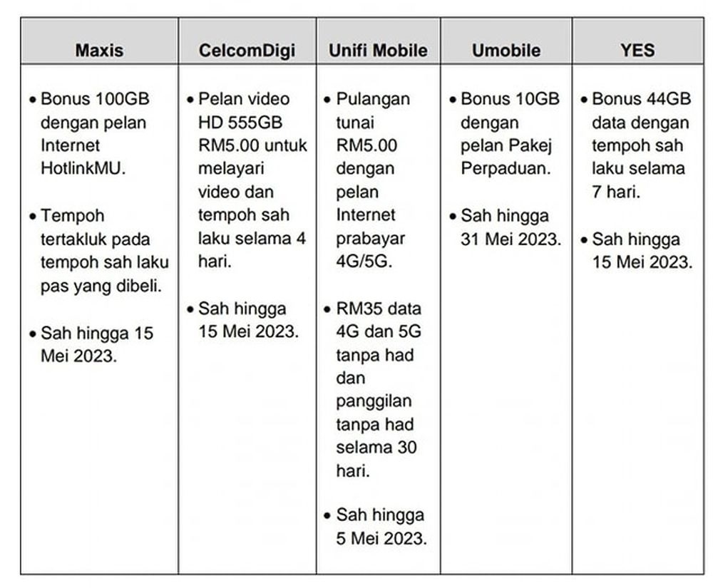 According to the official statement, the offers are subject to the respective terms and conditions of each telco. Customers are advised to refer to the respective telco for further details.
