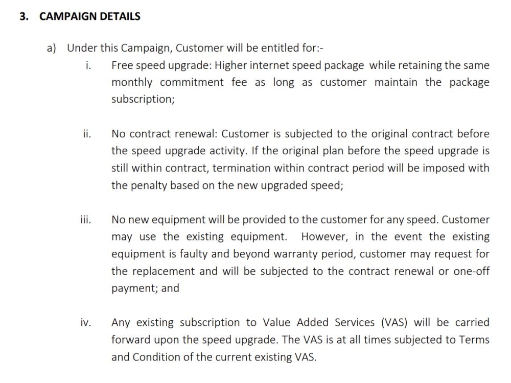 As highlighted in the T&C, customers are entitled to be upgraded to a higher internet speed package while maintaining the same monthly commitment fee as long as the customer maintains the package subscription. It is also mentioned clearly that there’s no contract renewal and customers will still maintain the original contract before the speed upgrade activity. This means if you’re on an existing Unifi contract, you will still have to pay a penalty if you terminate before the contract ends.