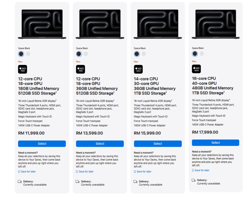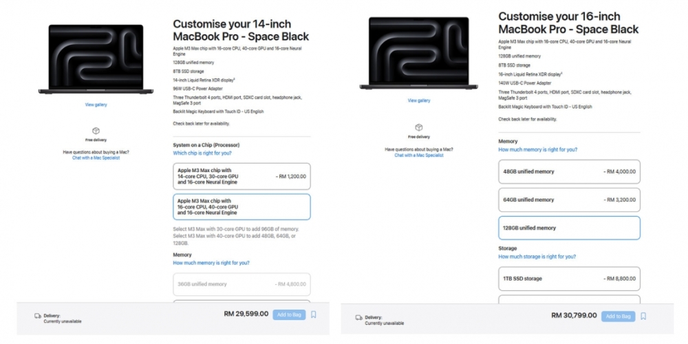 For those with a bottomless wallet, you can go ahead and max out the MacBook Pro 14 and 16. You will need to pay RM 29,599 for the 14-inch MacBook Pro with the 16-core CPU and 40-core GPU M3 Max chip, 128GB of unified memory and 8TB of SSD storage.